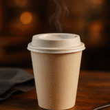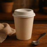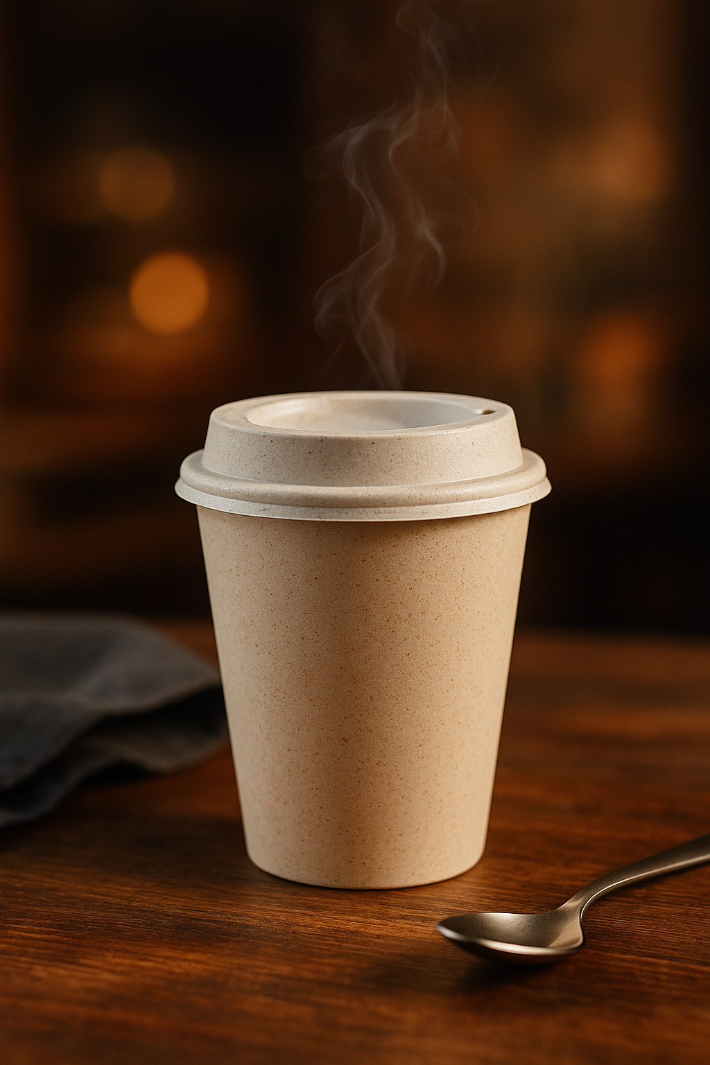 Enjoy your coffee guilt-free with this stylish and sustainable travel cup. Designed to replace single-use paper cups, this reusable sipper features a warm, natural beige tone with a subtle, speckled texture, giving it an earthy, eco-chic look. The secure light-gray or white lid fits snugly, preventing spills and keeping your beverage hot, as demonstrated by the rising steam. Perfect for commuting, the office, or running errands, this durable cup is your essential partner for on-the-go drinks.