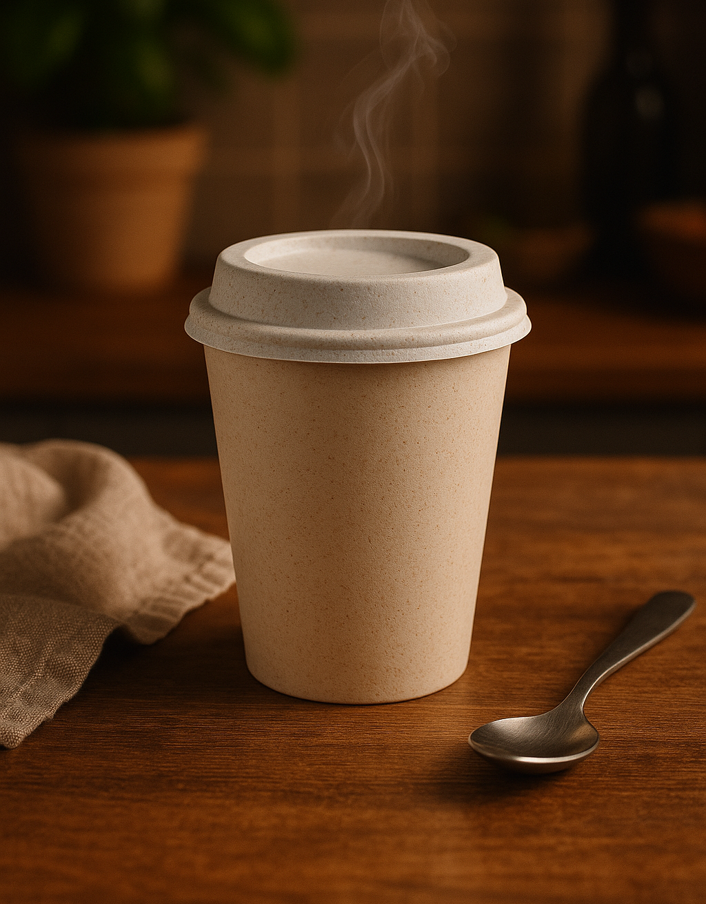 Eco-friendly reusable travel cup with a natural speckled finish and secure lid. Your stylish alternative to disposable cups.