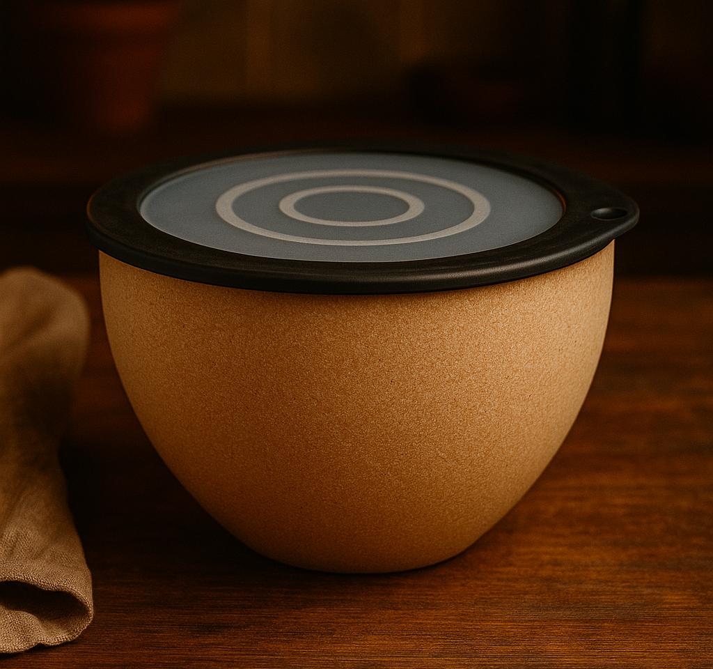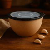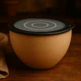Elevate your kitchenware with this unique, multi-purpose bowl. The body features a beautiful natural cork or wood-like texture in a warm, inviting tone, offering a comfortable grip and a rustic-modern aesthetic. It is topped with a secure dark rimmed lid that includes a distinct, minimalist concentric circle design on the surface.