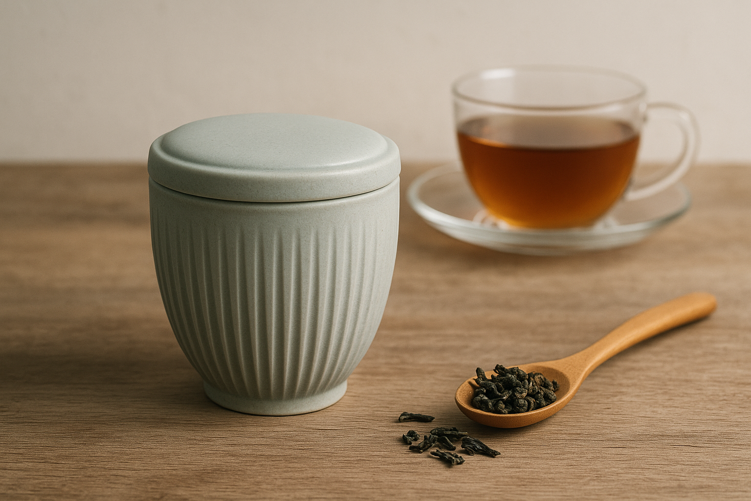 Modern ribbed canister with a matte gray-green finish. The perfect blend of form and function for your tea corner.